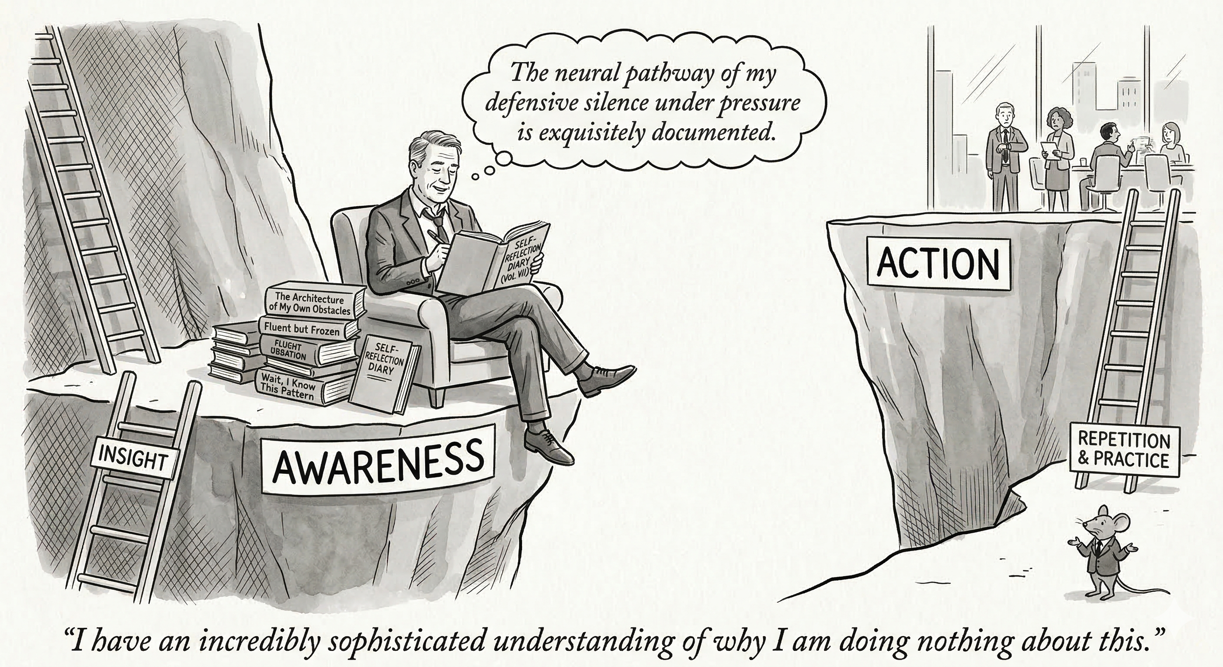 The insight becomes the destination, rather than the beginning of the journey. And the more fluent the leader becomes in describing the pattern, the easier it is to mistake that fluency for progress.